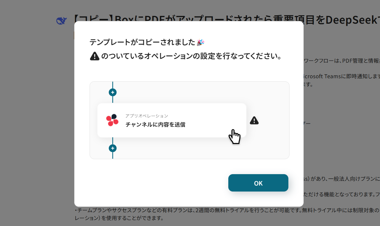 Yoomのワークスペースにテンプレートがコピーされ、フローの設定画面が開きます。 「OK」をクリックして、フローの設定に進みましょう。