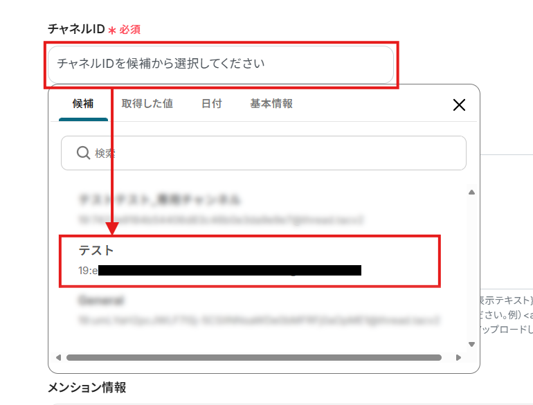 「メッセージ」に投稿する任意の内容を設定。 入力欄クリック時に表示される「取得した値」タブから、各アクションで取得した値が選択可能です。 これらの値を用いて、投稿するメッセージを作成しましょう。