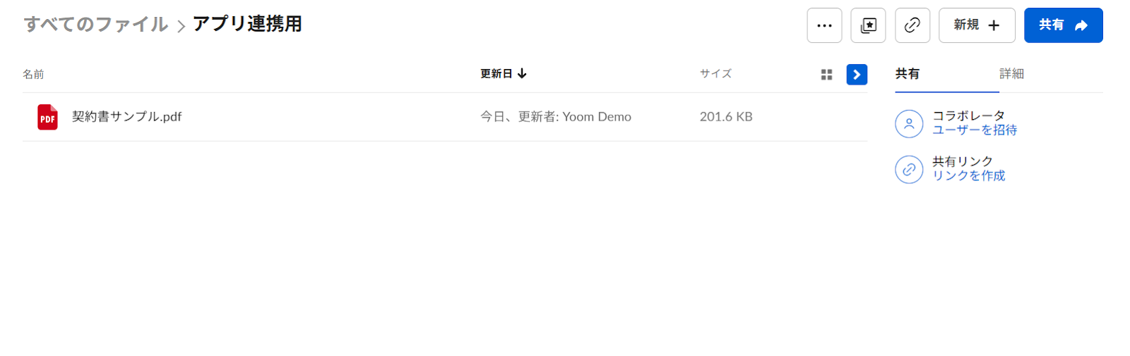 ここでは例として、「アプリ連携用」フォルダに「契約書サンプル.pdf」をアップロードしています。