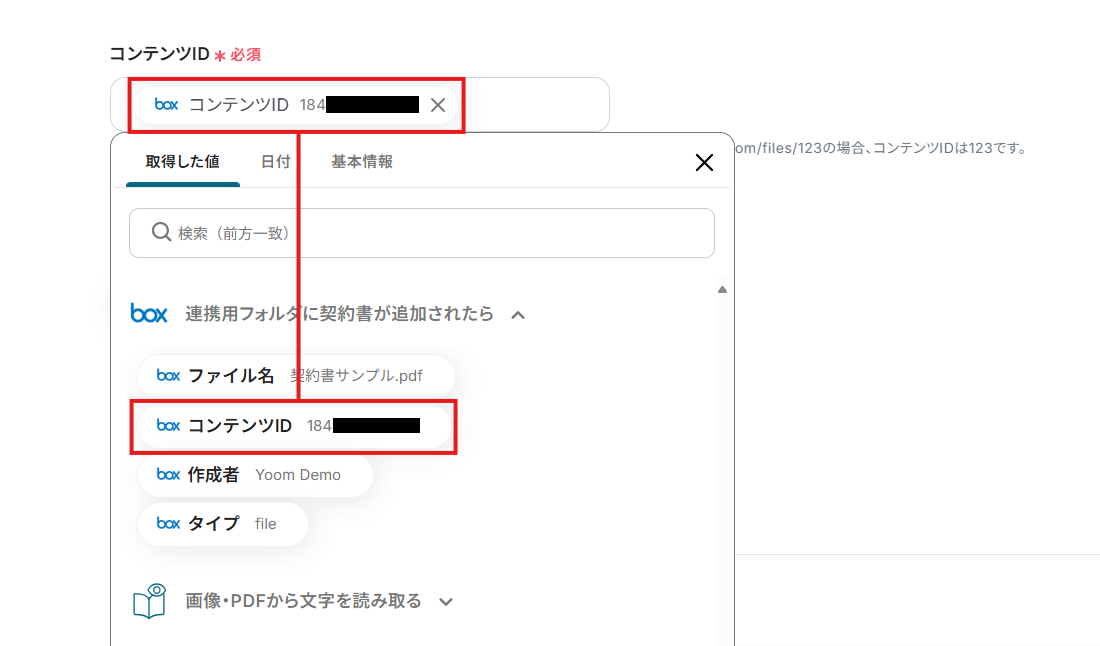 「コンテンツID」にはデフォルトで、ステップ3で取得したファイルのコンテンツIDが設定されています。 このような「取得した値」は、フローが稼働する度に更新されます。 取得した値(アウトプット)についての詳しい説明は、こちらのヘルプページ をご覧ください。