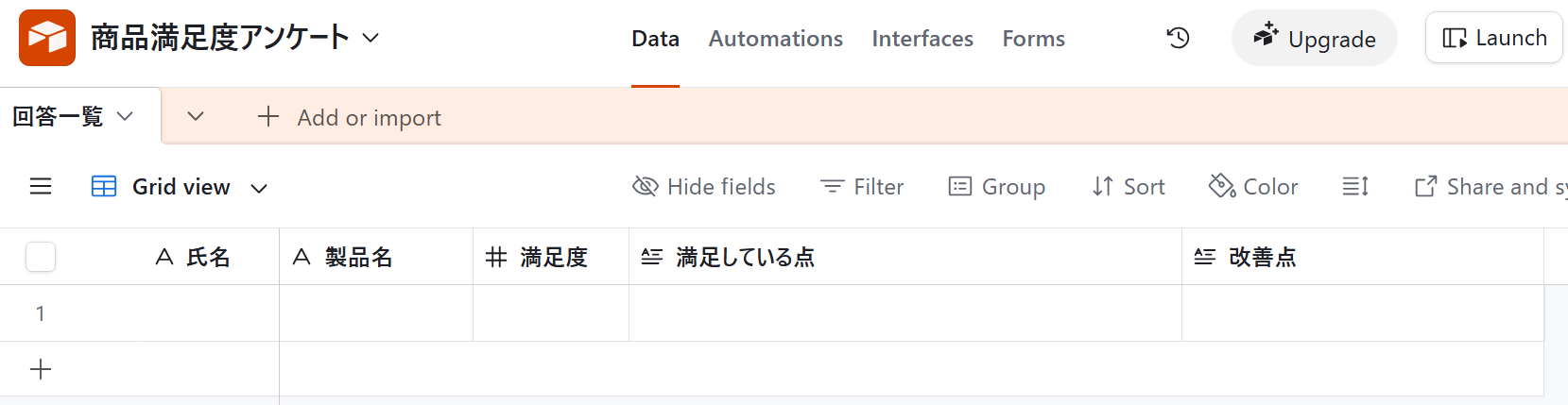 ステップ5:Airtableのアクション設定 ステップ3で取得した回答内容や、先ほど抽出した項目をAirtableに記録します。 まず準備として、記録するためのテーブルをご用意ください。
