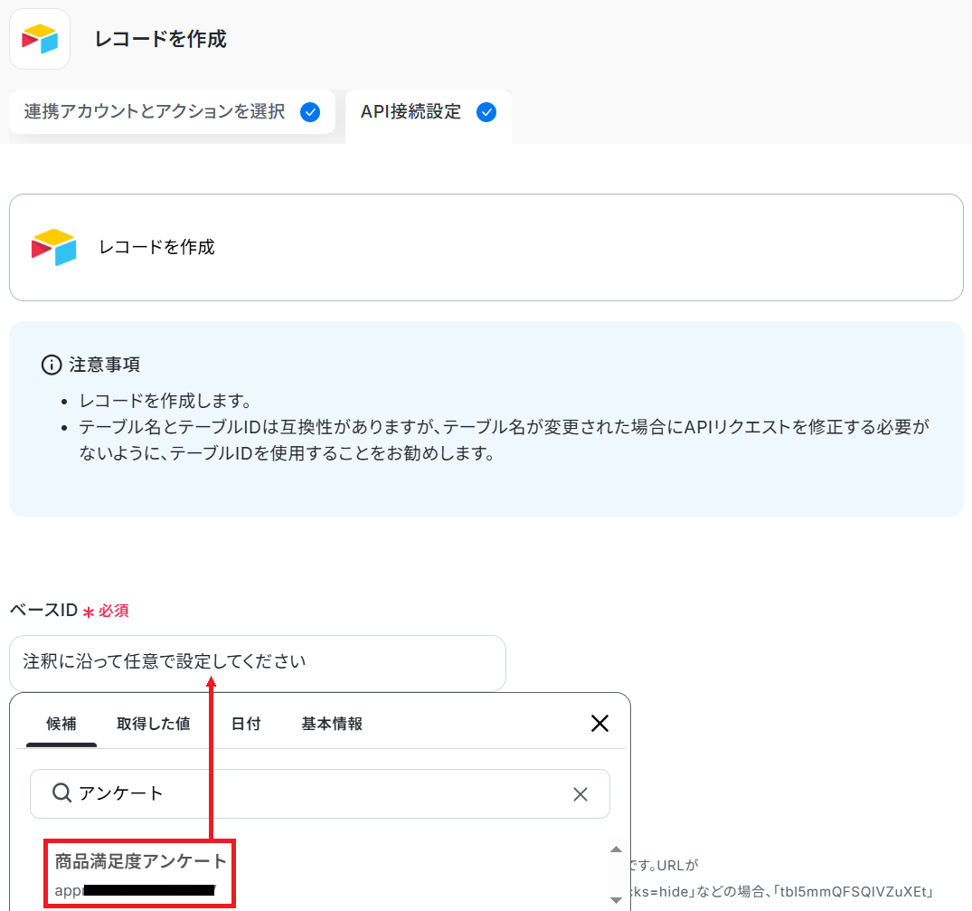 まず、先ほど用意したテーブルのベースID を候補から選択してください。