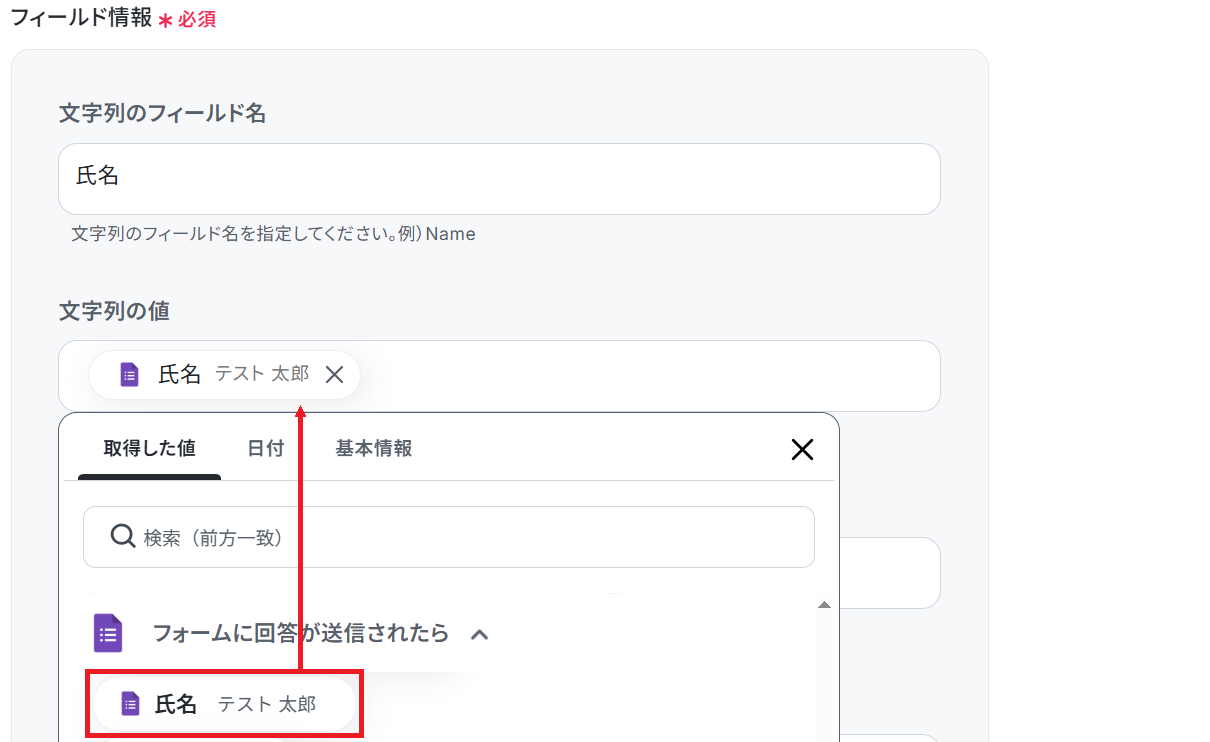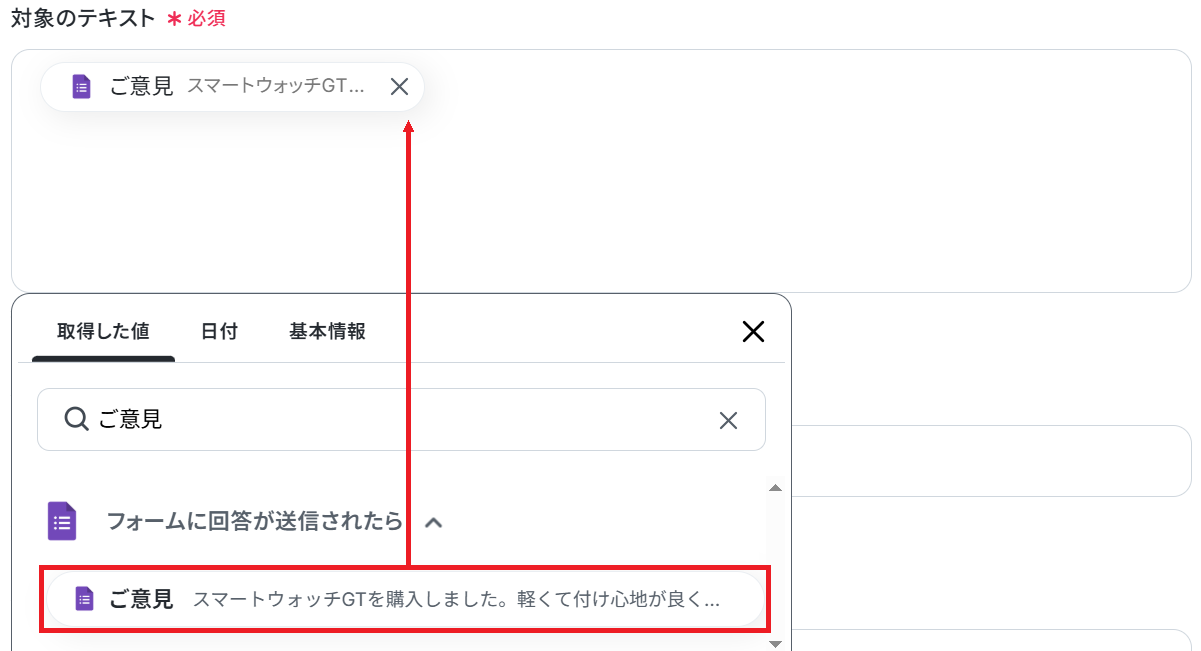 対象のテキスト の欄には、Googleフォームから取得した値が予め設定されているのでそのままで大丈夫です。