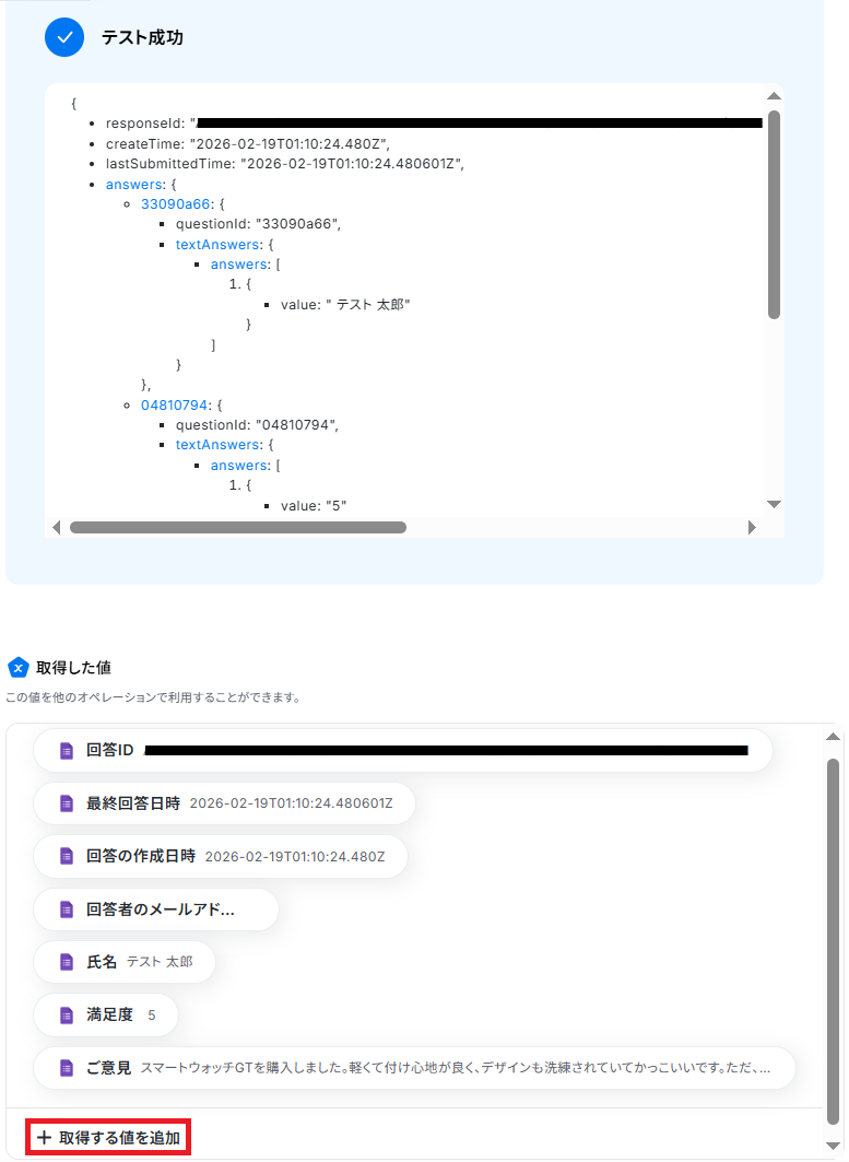 なお、取得した値に取得したいレコードが反映されていないことがあります。その場合「+ 取得する値を追加」から項目を追加可能です。Googleフォームトリガーで、回答内容を取得する方法