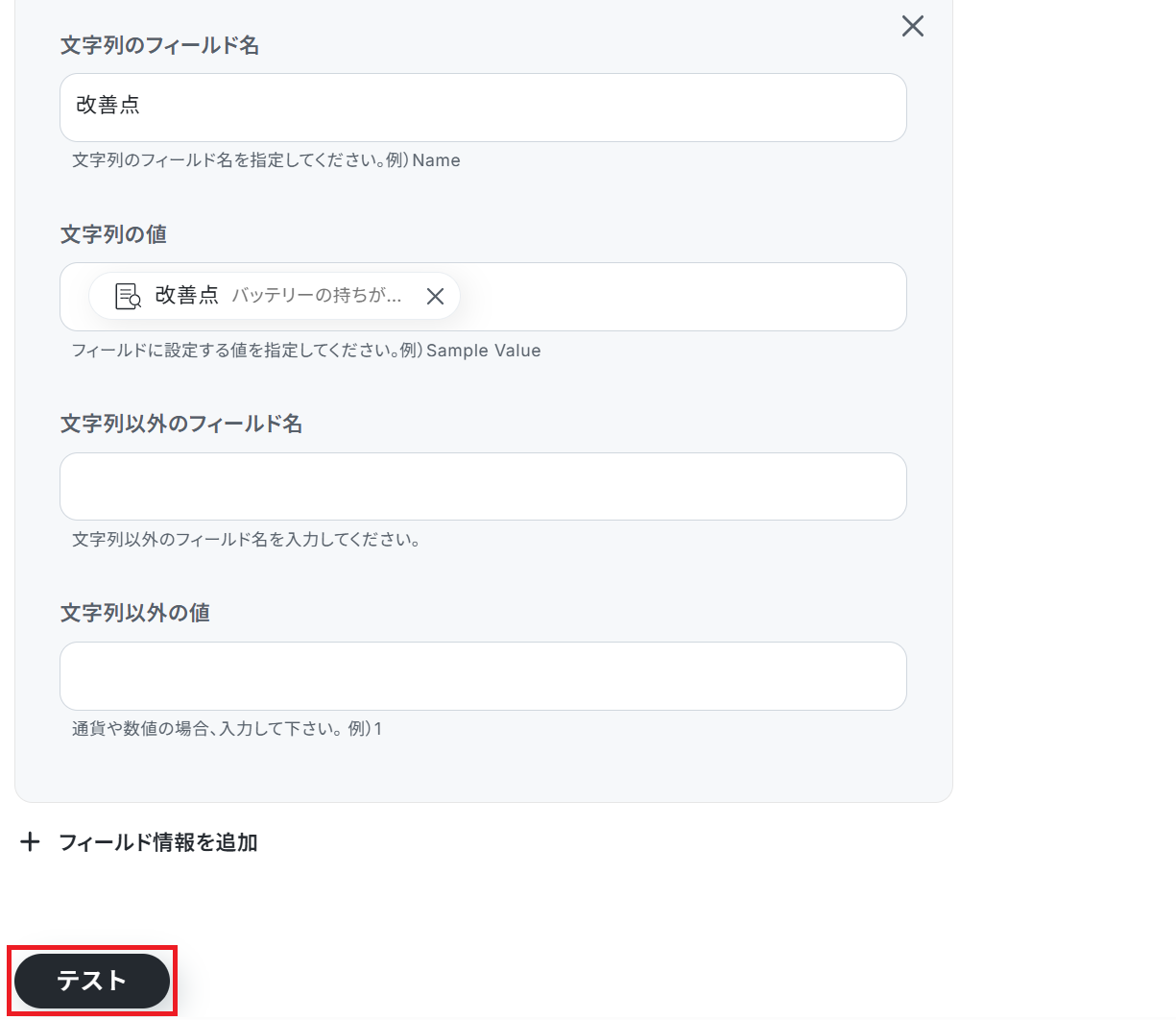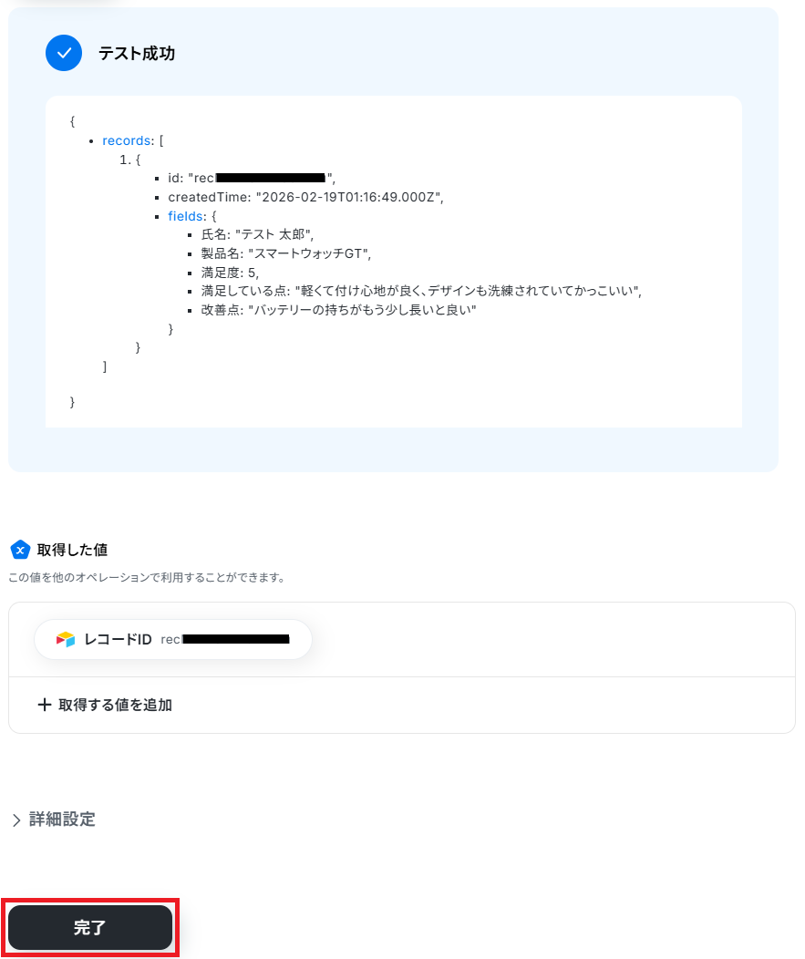 文字列の値 …レコードに記録したい内容です。ステップ3で取得した「氏名」や「満足度」、ステップ4で抽出した「製品名」や「改善点」などの値を設定してください。
