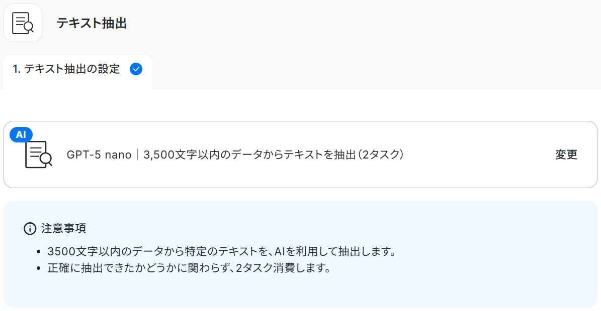 テキスト抽出機能のアクションは以下の種類がありますので、扱う文章の長さに合わせて選択しましょう。()内のタスクを消費しますので、使用プランやデータの容量によって選択してください。料金プランについて