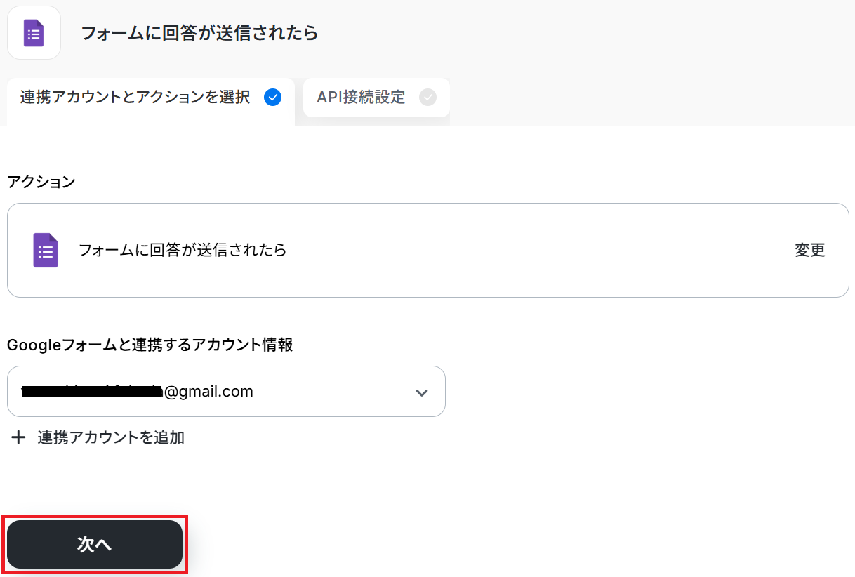 タイトル と連携するアカウント情報 を任意で設定し、アクションはテンプレート通りに「フォームに回答が送信されたら」のまま「次へ」をクリックします。