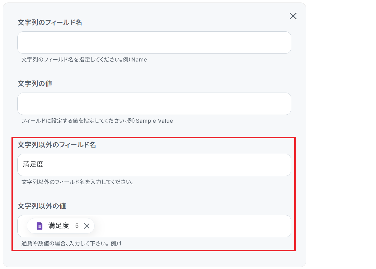 「氏名」や「製品名」などの項目は文字列のため文字列のフィールド名 ・文字列の値 の欄を使用しています。数字で入力される「満足度」など、文字列以外を記録したい場合は文字列以外のフィールド名 ・文字列以外の値 の欄をお使いください。