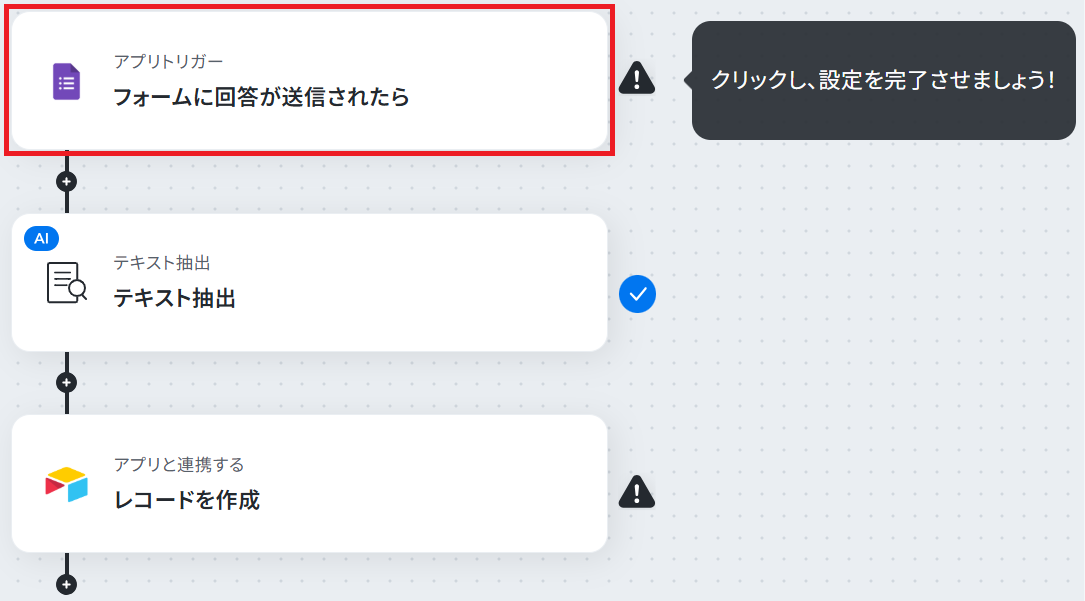 Googleフォームのトリガー設定、テキスト抽出設定、Airtableのアクション設定