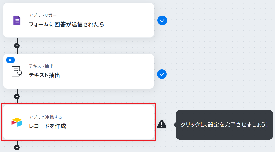 Googleフォームのトリガー設定では、自動化の対象としたいフォームのIDを任意で設定してください AI機能のオペレーションでは、フォームの回答の中からキーワード抽出の対象としたいテキスト項目を任意で指定できます Airtableのオペレーションでは、レコードを作成するテーブルや、前段で取得した値をどのフィールドに登録するかを自由に設定可能です ■注意事項