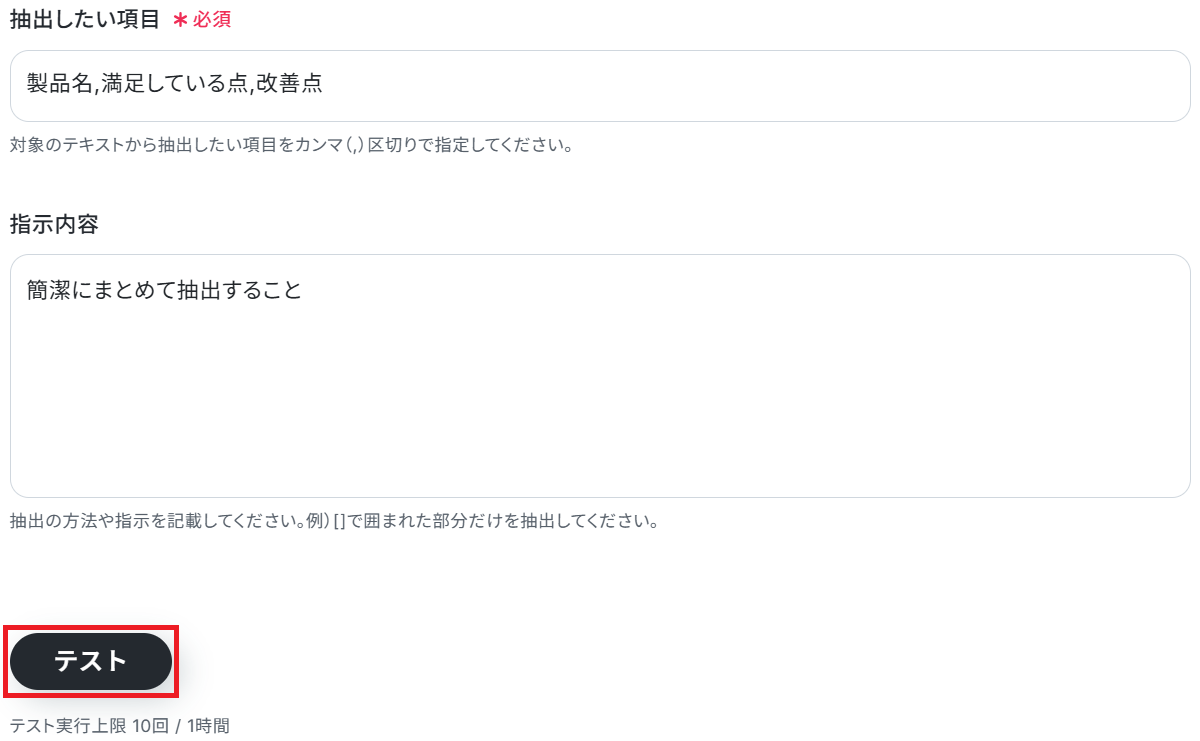抽出したい項目 も設定されていますが、編集・追加する場合はカンマ区切りで入力しましょう。 任意で指示内容 も入力できます。設定が完了したらテストしてください。