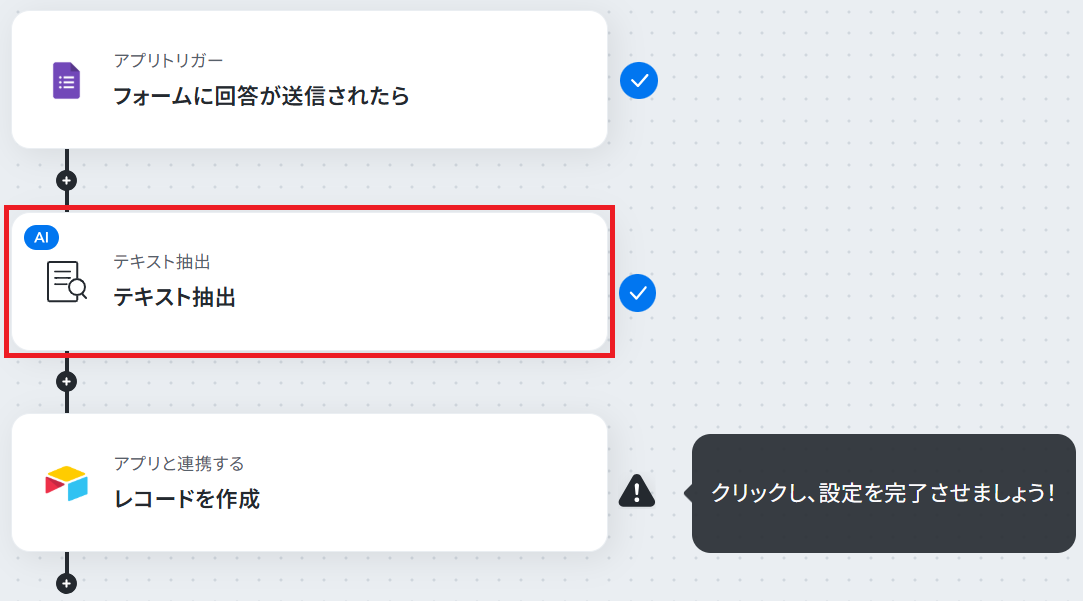 ステップ4:テキスト抽出設定 先ほど取得したGoogleフォームの回答内容から、Airtableに記録したい項目を抽出します。 「テキスト抽出」をクリックしましょう。