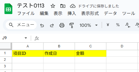 今回のフローで使用したいGoogle スプレッドシートの作成がまだの方はこのタイミングで作成しましょう。Googleスプレッドシートの表やヘッダーに関する注意点 を参考に作成してください。 例として以下のように作成しました!