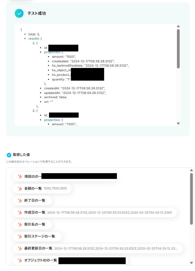 設定できたら「テスト」を行いましょう。 テストに成功すると「取得した値」に反映されます。