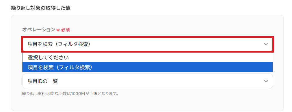 「繰り返し対象の取得した値」を設定しましょう。 「オペレーション」を「項目を検索(フィルタ検索)」に設定します。