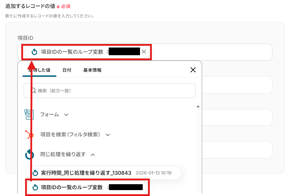 「追加するレコードの値」を「取得した値」から設定します。