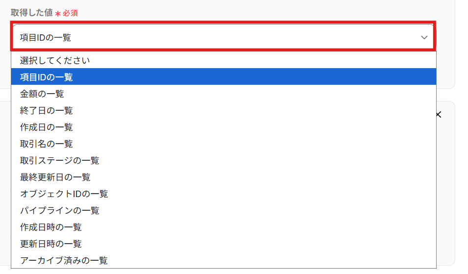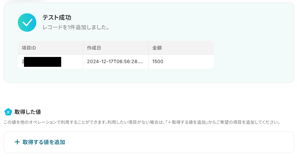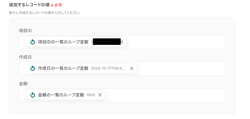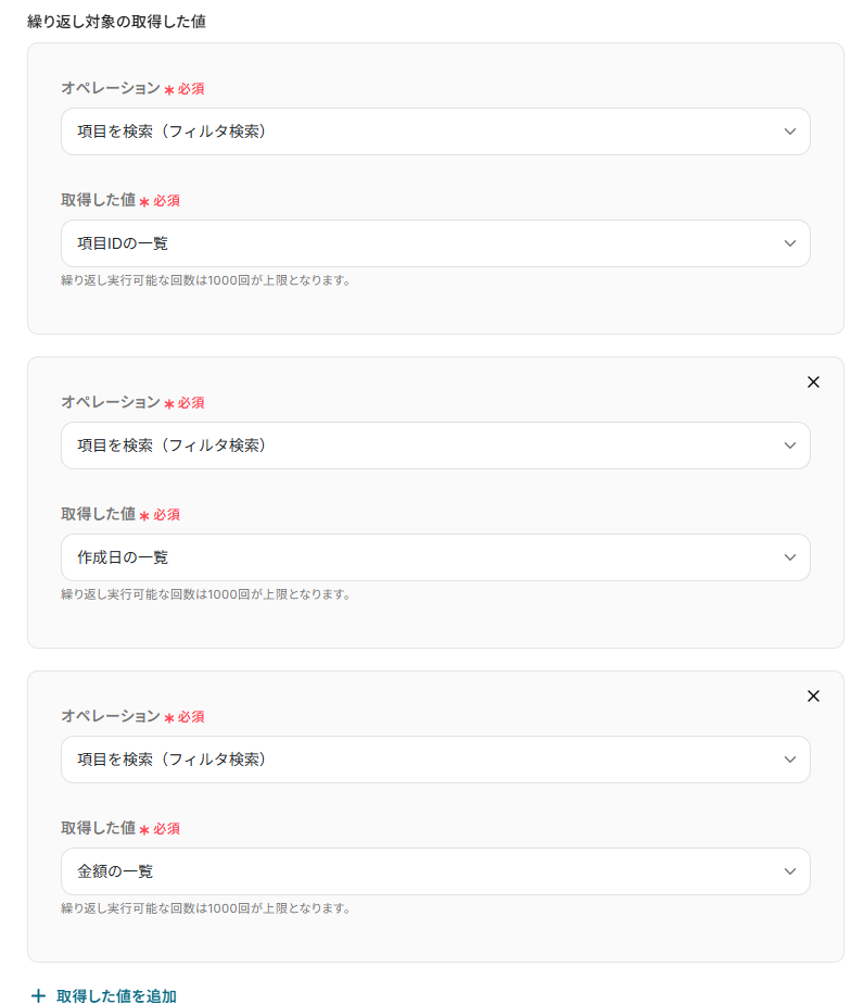 「取得した値」を候補から選択しましょう。 Google スプレッドシートにレコードを追加する際に使用したい値を設定してくださいね。 今回は例として、「取得した値」に「項目IDの一覧」・「作成日の一覧」・「金額の一覧」を設定しました! また、「+取得した値を追加」から「繰り返し対象の取得した値」を増やすことが可能です!