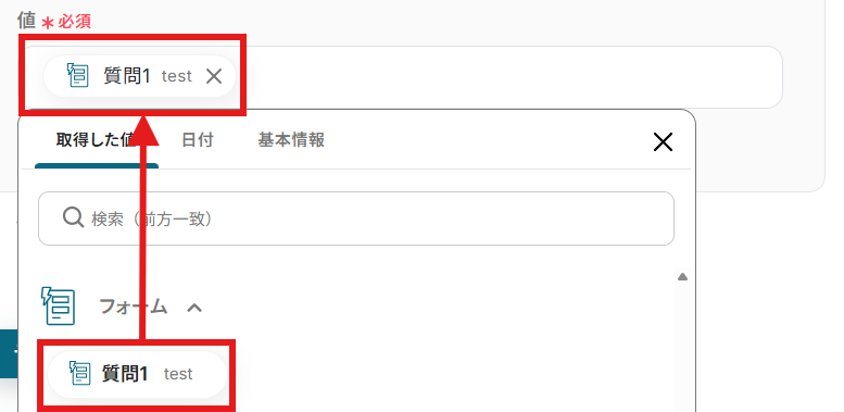 「値」を「取得した値」から設定しましょう。 取得した値は変数として扱われます。固定値ではないため、トリガーが実行されるたびに取得した情報を反映できます。