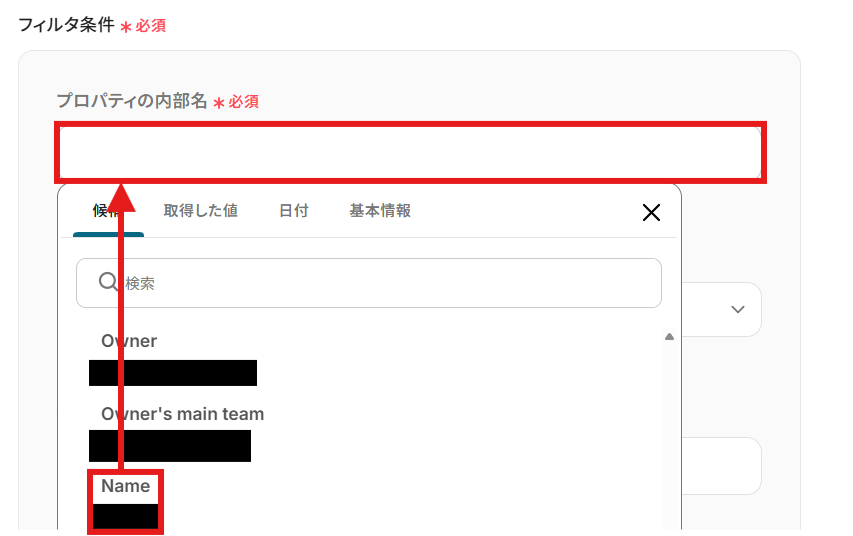 「フィルタ条件」を設定します。 「プロパティの内部名」を候補から選択しましょう。