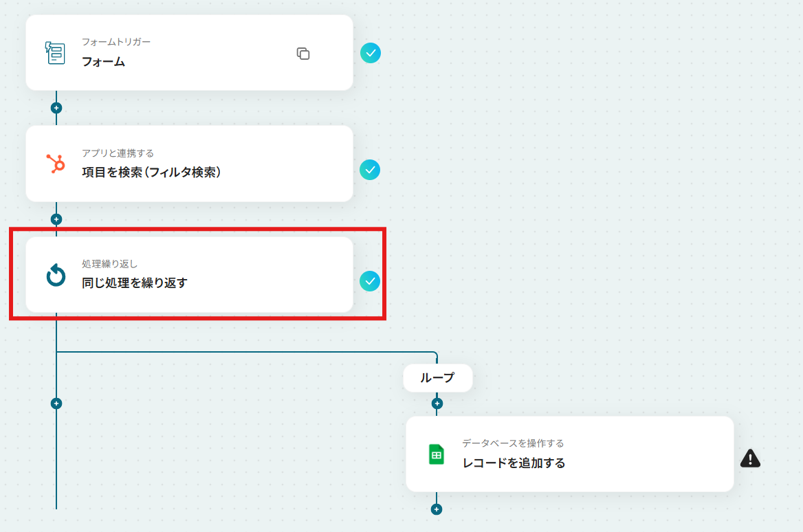 前のステップでは、複数のレコードを取得する場合があります。 取得したレコードを1件ずつ処理するために、「同じ処理を繰り返す」設定を行います。