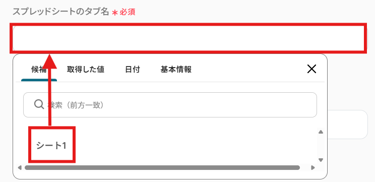 「スプレッドシートのタブ名」を候補から選択しましょう。