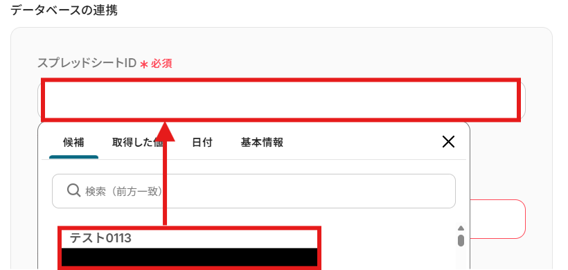 「データベースの連携」を設定しましょう。 「スプレッドシートID」を候補から選択します。