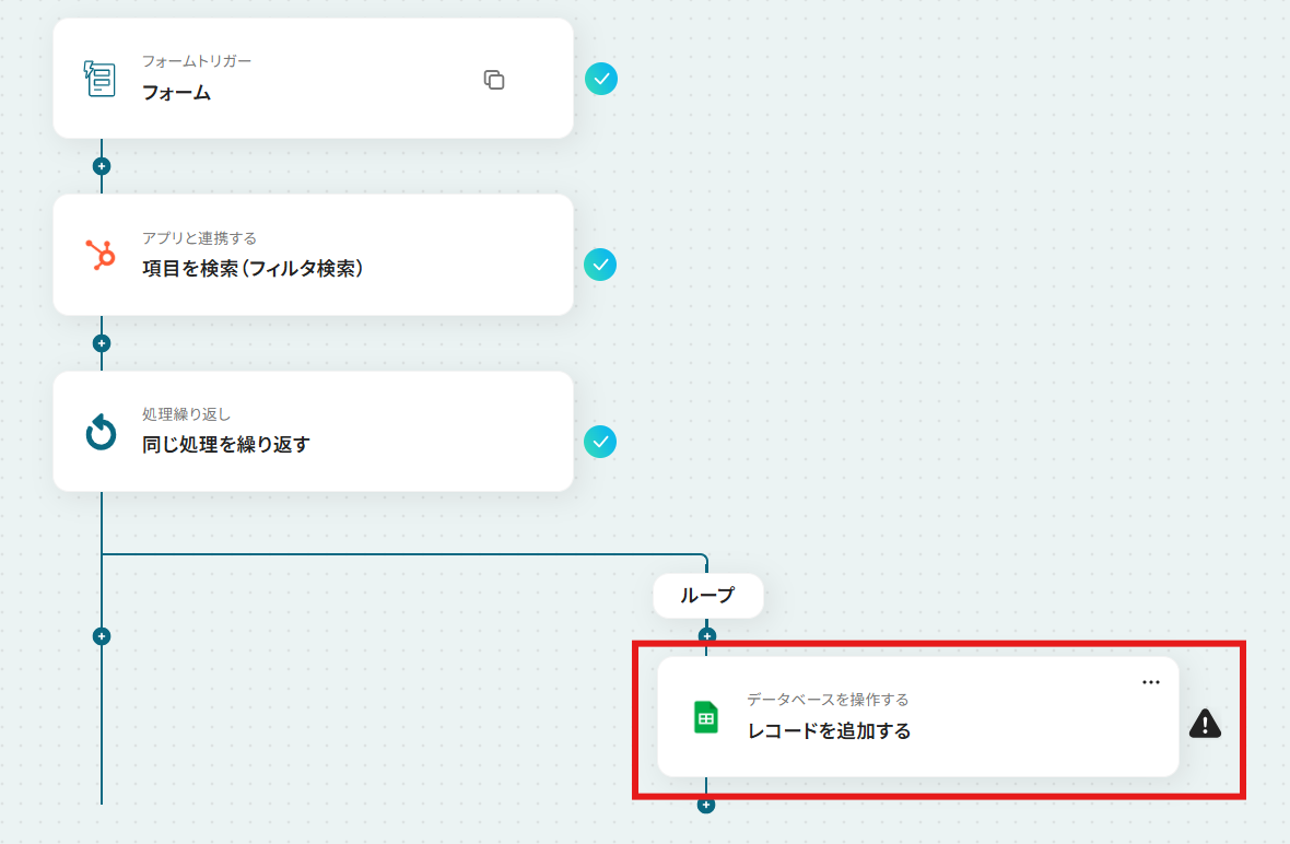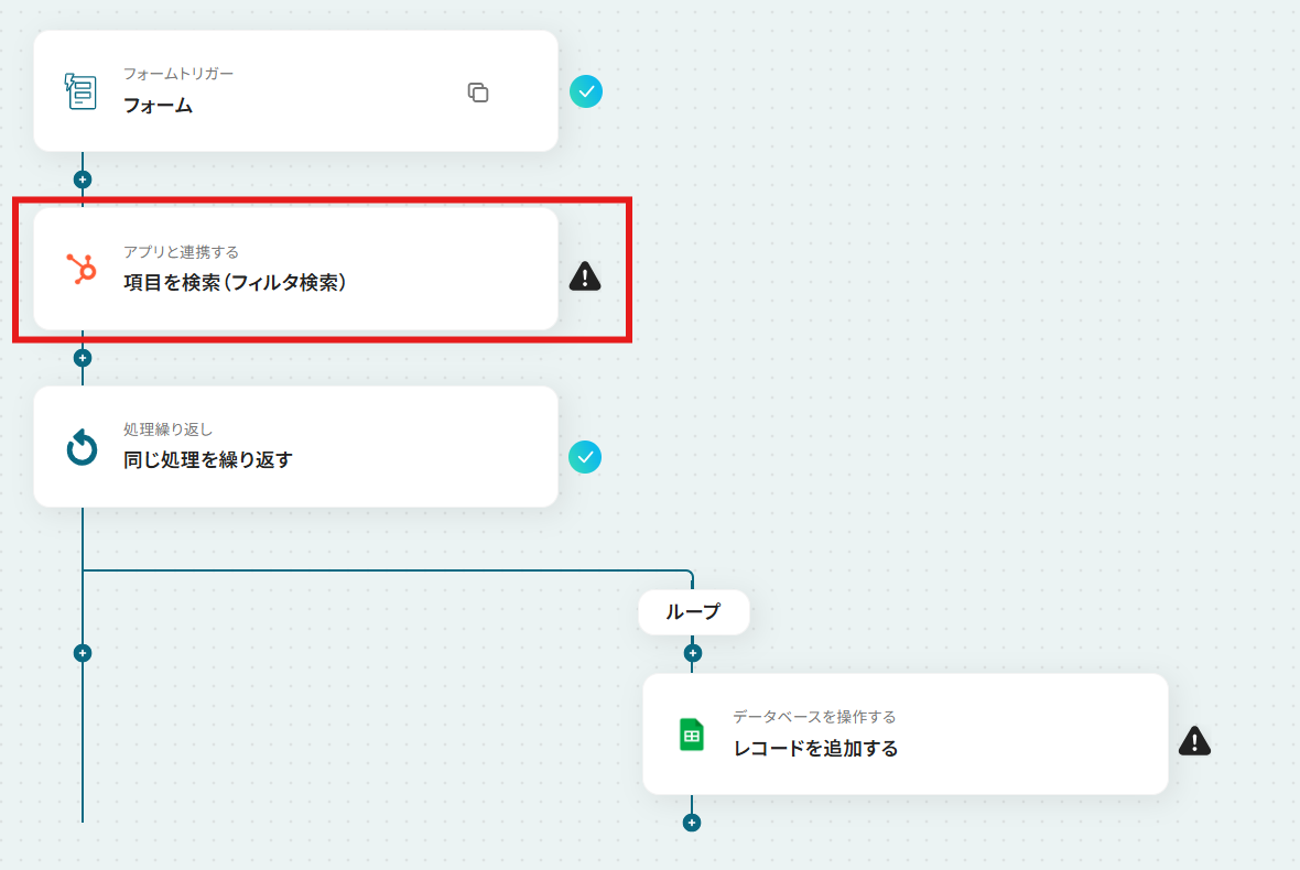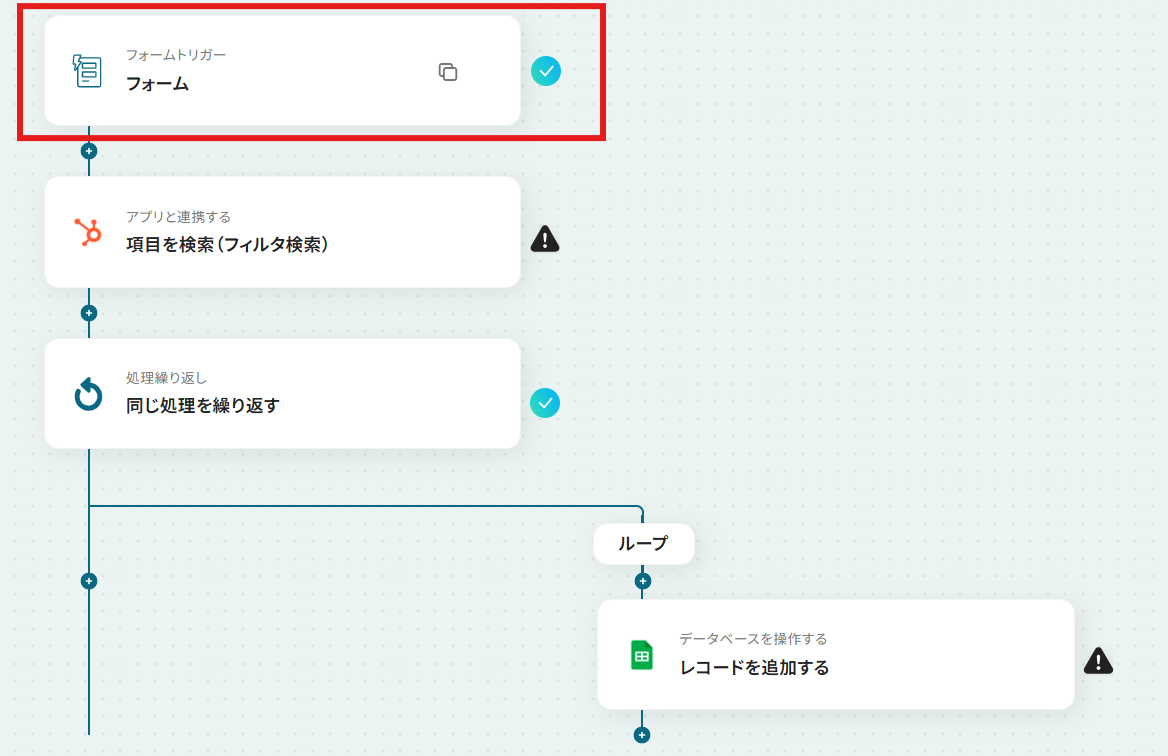 フォームトリガーの質問項目やタイトルは、取得したい情報に応じて任意で編集してください。 HubSpotの「項目を検索(フィルタ検索)」では、抽出したい条件に合わせてフィルタを任意で設定してください。 繰り返し処理の対象として、前のステップで取得したHubSpotの検索結果を指定してください。 Google スプレッドシートへの書き込み先として、任意のファイルIDとシート(タブ)名を設定してください。 ■注意事項