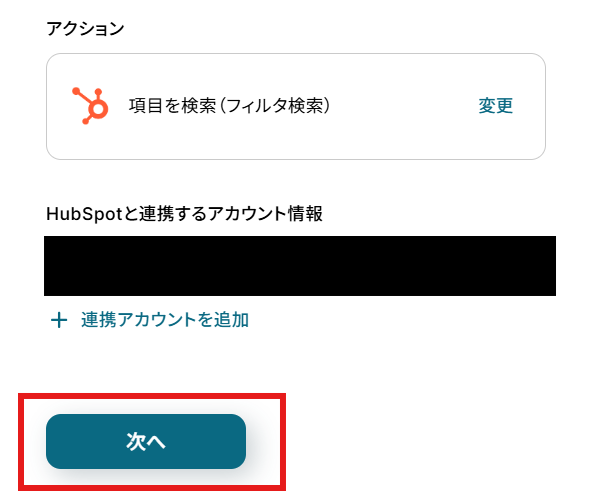 「アクション」はテンプレート通りのままでOKです! 「HubSpotと連携するアカウント情報」を確認し、「次へ」をクリックして進んでください。