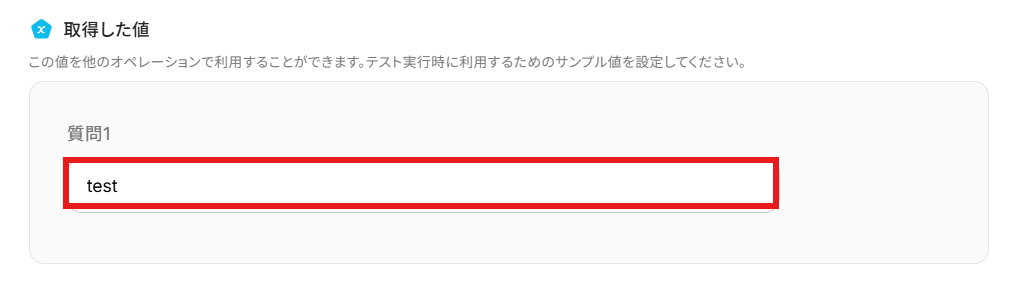 「取得した値」にサンプルとして手動で回答を入力しましょう。 ここでの回答を後続のオペレーションで使用します。 実際のフロー稼働時は、回答された内容が反映されるので安心してください。 回答できたら「完了」を選択してくださいね。
