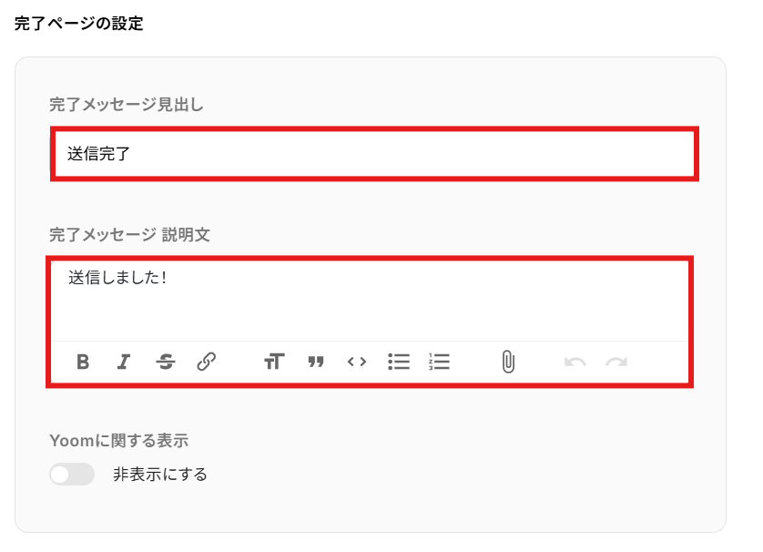 完了ページは以下の「完了ページ」から確認可能です。 その他の項目は有料プランでのみ設定可能な場合もあります。