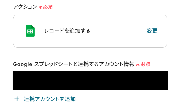 「アクション」はテンプレート通りのままでOKです! 「Google スプレッドシートと連携するアカウント情報」を確認してください。
