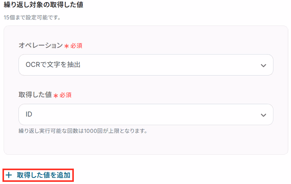 項目は「+ 取得した値を追加」から最大15個まで設定できます。