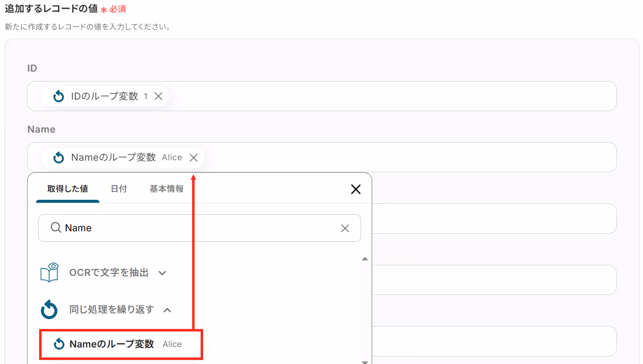 以下のように繰り返し設定をもとにした各項目のループ変数の値を指定すると、処理を繰り返すごとに各行の値が反映されます。