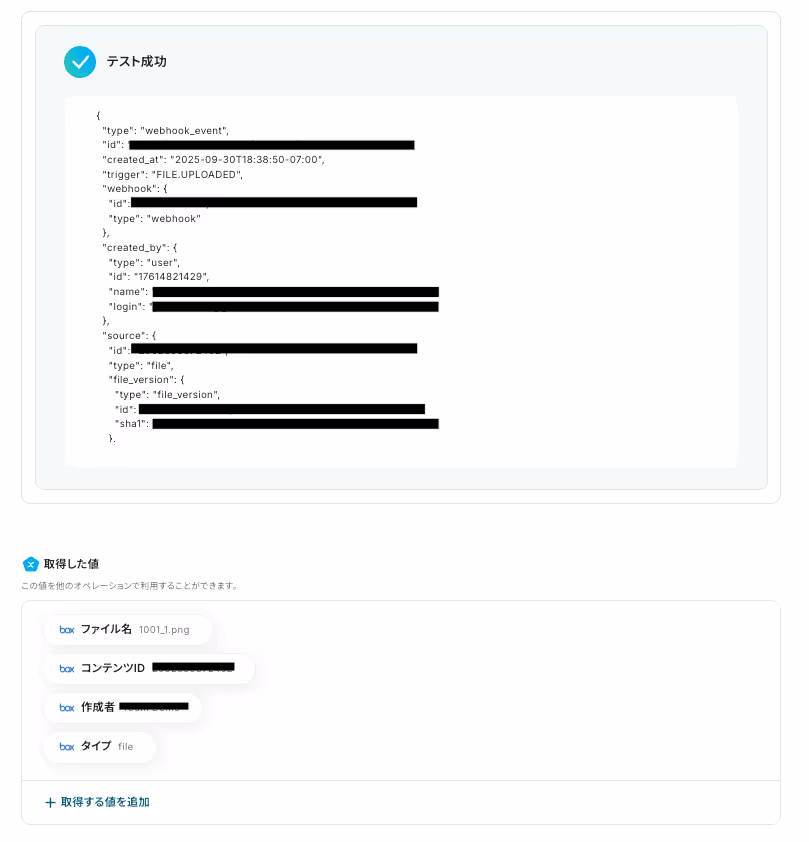 テストが成功すると、以下のように「取得した値」が表示されます。