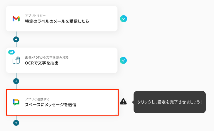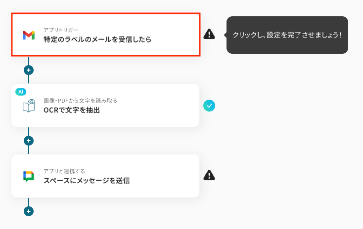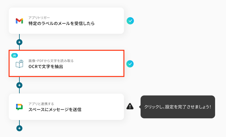 Gmailのトリガー設定、OCRとGoogle Chatのアクション設定