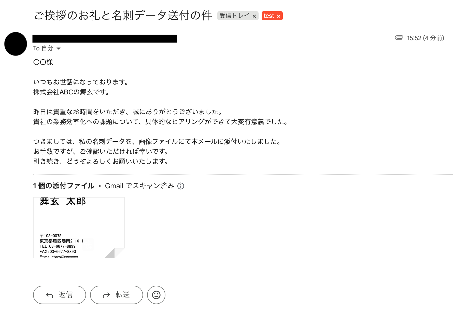 この記事では、サンプルとして以下の画像ファイル(名刺)をGmailに添付しています。