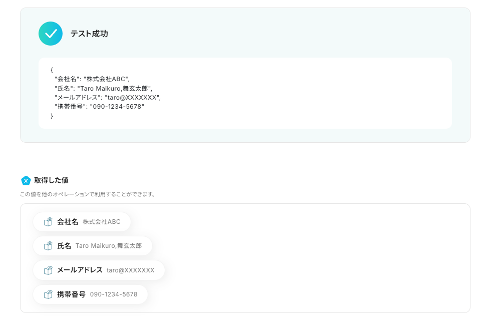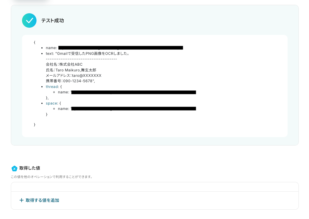 テストが成功すると、以下のように「取得した値 」が表示されます。 ※「取得した値」は、後のフローで使用します。