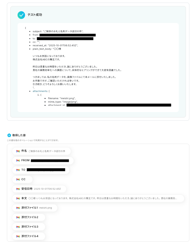 Gmailで受信したPNG形式の添付ファイルを自動でOCR処理し、内容をテキスト化する ことで、請求書や画像データの確認・転記作業の効率化に繋がります。