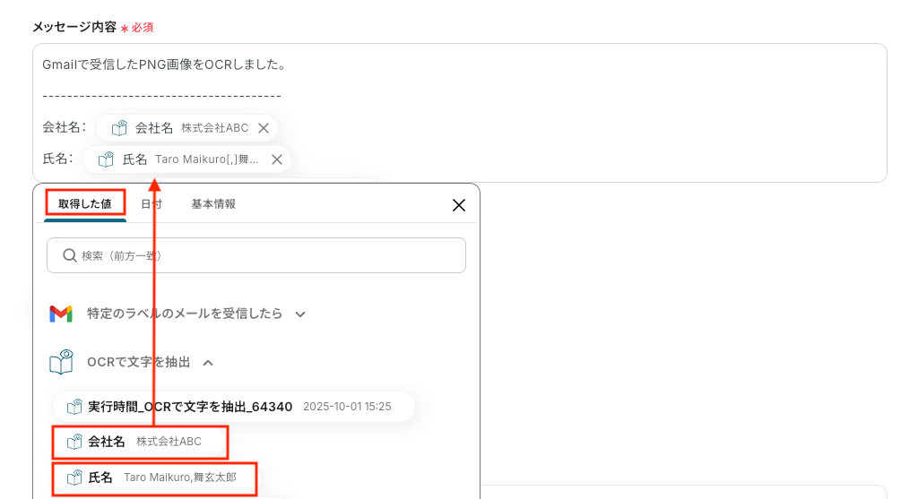 「メッセージ内容」は取得した値から選択し、必要に応じて任意のテキストを手動で入力してください。