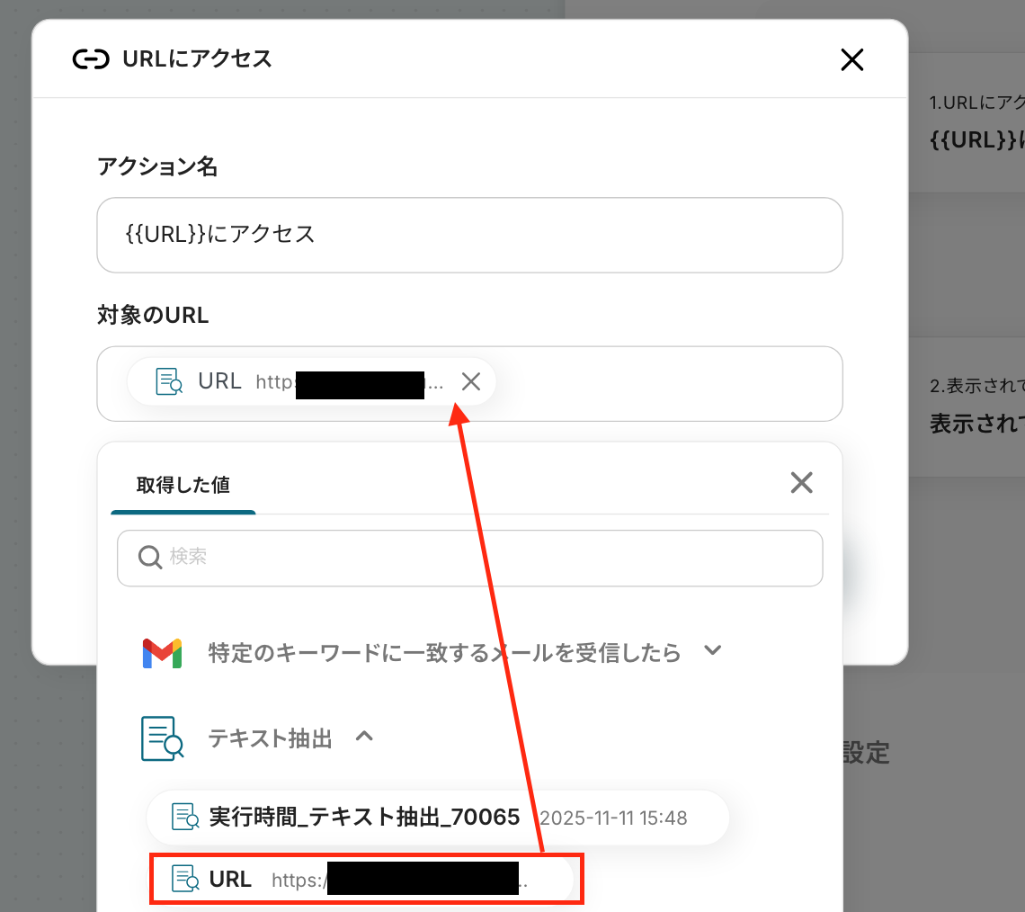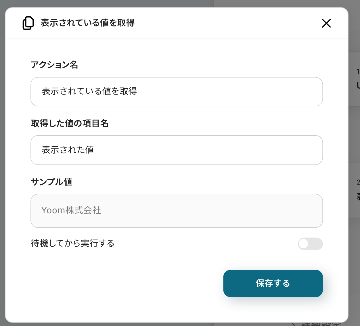 次に「2.表示されている値を取得」をクリックし、「アクション名」と「取得した値の項目名」を入力しましょう。