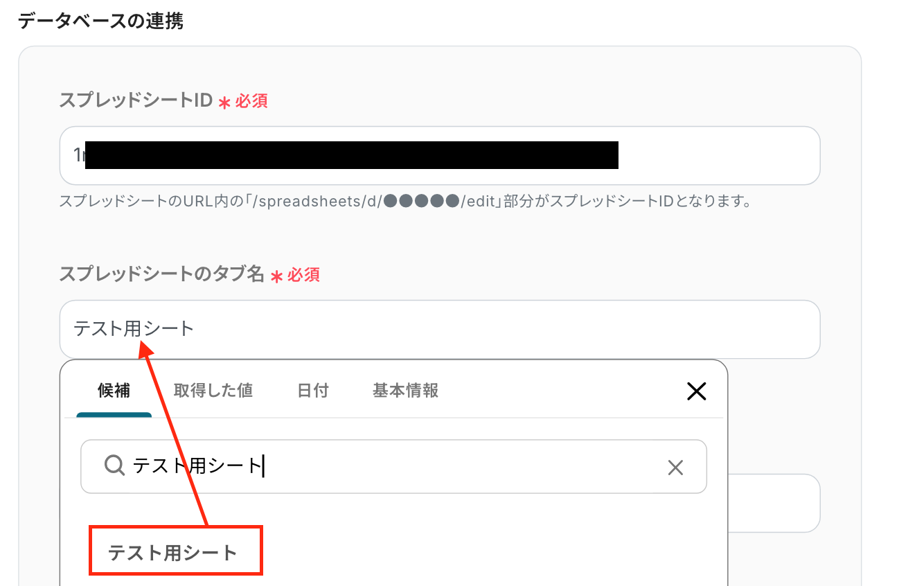 スプレッドシートIDやタブ名はボックスをクリックして表示される「候補」から選択可能です。