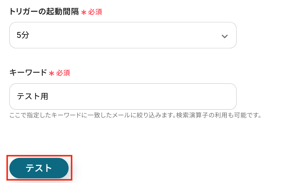 ※以下のメールを受け取った設定で進めていきます。キーワードは「テスト用」に設定しました。