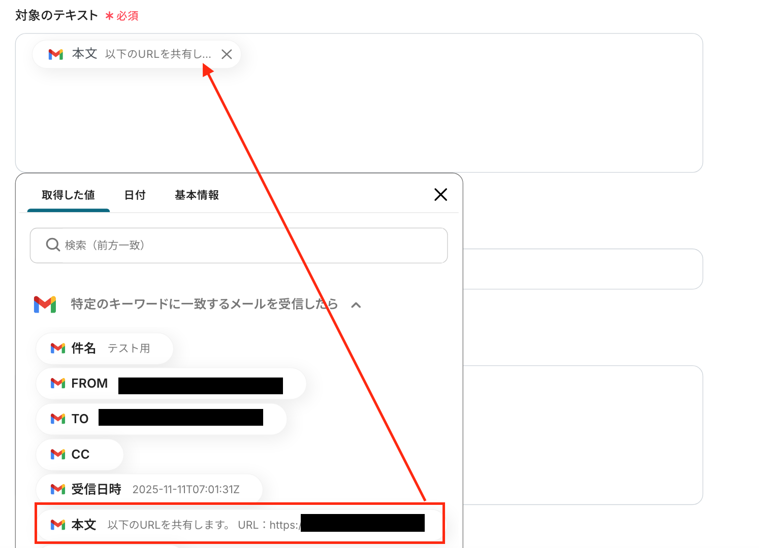 以下の画像のように、入力欄をクリックして表示される取得した値を設定してください。