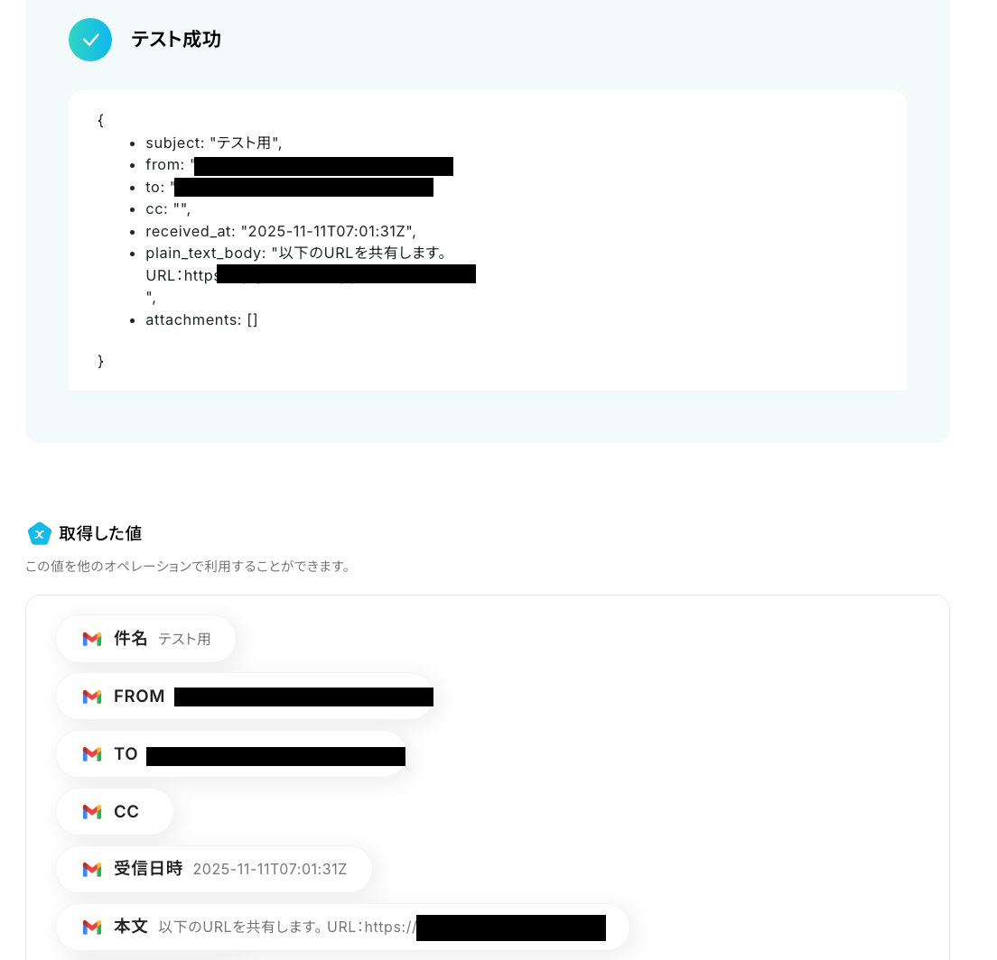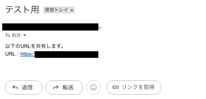 また、今回のフローでは受信メール内のURLをもとに設定を進めるため、URLを含んだ文章をテスト送信してください。