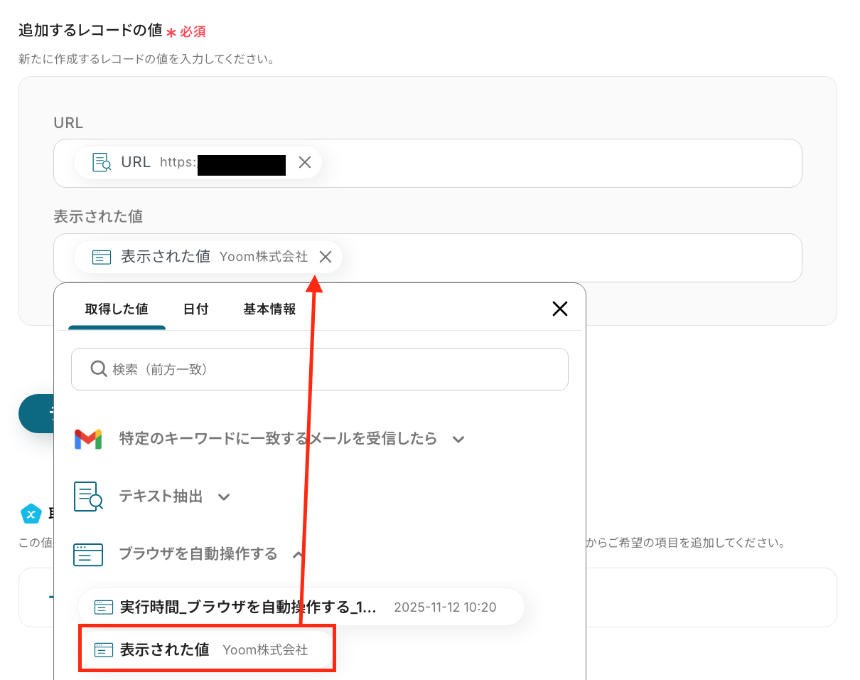 「追加するレコードの値」には、これまでのステップで取得した値を引用して該当する値を設定しましょう!