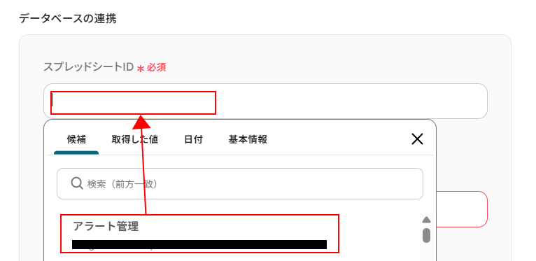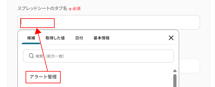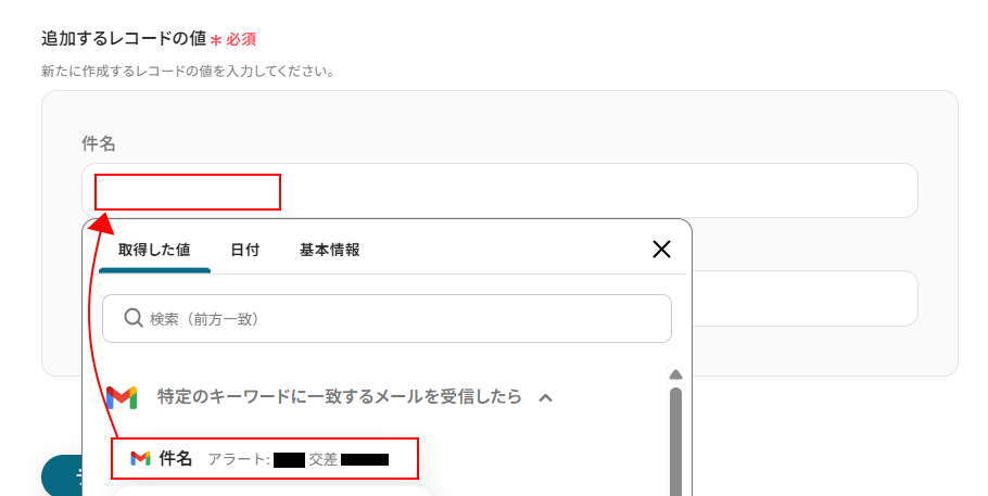 追加するレコードの値にはGoogle スプレッドシートに設定している項目名が表示されます。