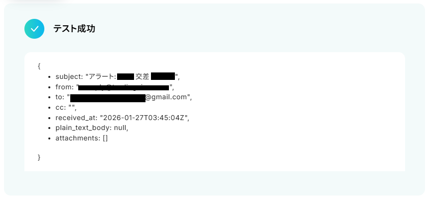 テストに成功するとテスト成功画面と取得した値が表示されますのでご確認ください。