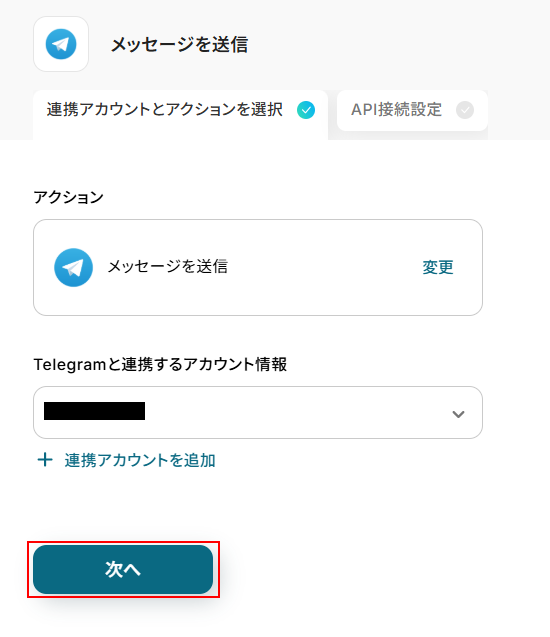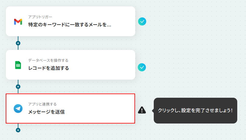- 最後に、オペレーションでTelegramの「メッセージを送信」アクションを設定し、指定のチャットグループへメール内容と記録された旨を通知します