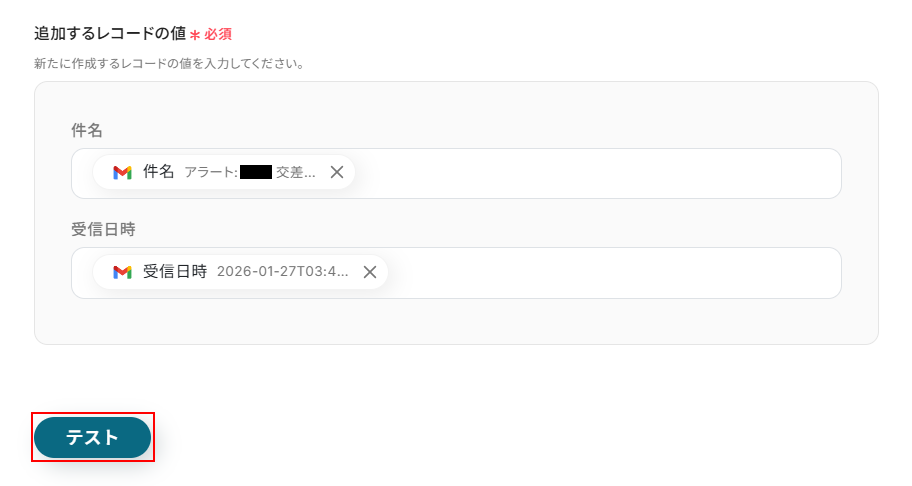 ※テストをクリックすることで、実際にレコードが追加されます。