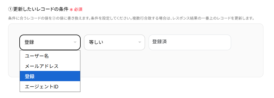 項目名をプルダウンメニューから選択し、更新したいレコードの条件を設定しましょう。